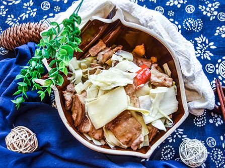 清新區(qū)是駱坑筍的原產(chǎn)地和主產(chǎn)地因為在我們古龍峽附近有條村子叫駱坑村所以稱它為駱坑筍在我們做這道菜時候我們選用了山地放養(yǎng)的土豬肉一起烹飪使得竹筍更加爽口香滑